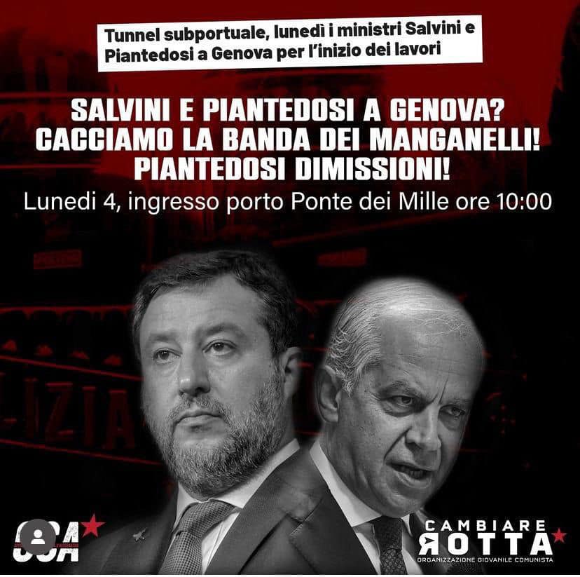 “Salvini e Piantedosi a Genova? Cacciamo la banda dei manganelli! Piantedosi dimissioni!", scrivono Cambiare Rotta e Osa.