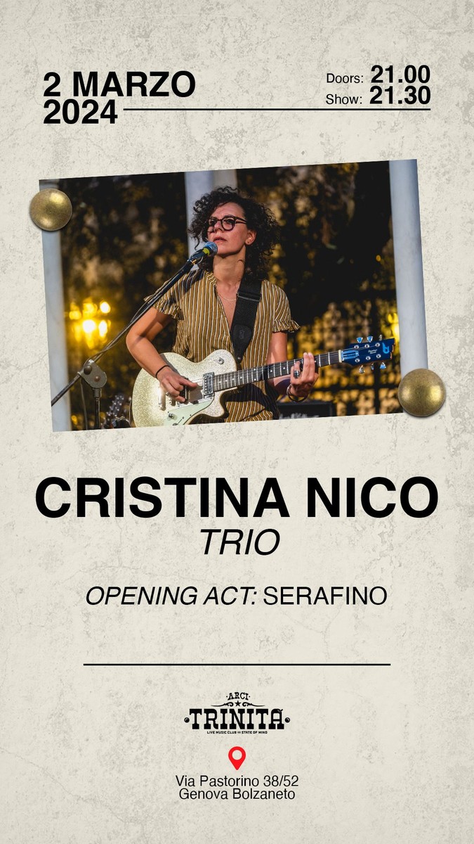 Cristina Nico è una cantautrice e musicista genovese che si esibirà al Circolo Arci Trinità di Bolzaneto. Ad accompagnarla dal vivo in questa speciale formazione in “trio cordofono” ci sono i due talentuosi musicisti e amici Roberto Zanisi (chitarra lapsteel, cümbüş, bouzouki, percussioni, voce), e Stefano Bolchi (chitarre, voce, timpano, sax). Il suo terzo disco, omonimo, è uscito a giugno 2022 per Lilith Label/Orange Home Records con la produzione artistica di Gliulio Gaietto: un lavoro che miscela folk, rock, world music e persino accenni trip-hop, e ha colpito la critica per l’eclettismo, lo spaziare tra diversi linguaggi musicali senza perdere in organicità e senza nulla togliere all’attenzione alla parola cantata, tipica della grande canzone d’autorə, che nel 2014 le ha fatto vincere il Premio Bindi.
