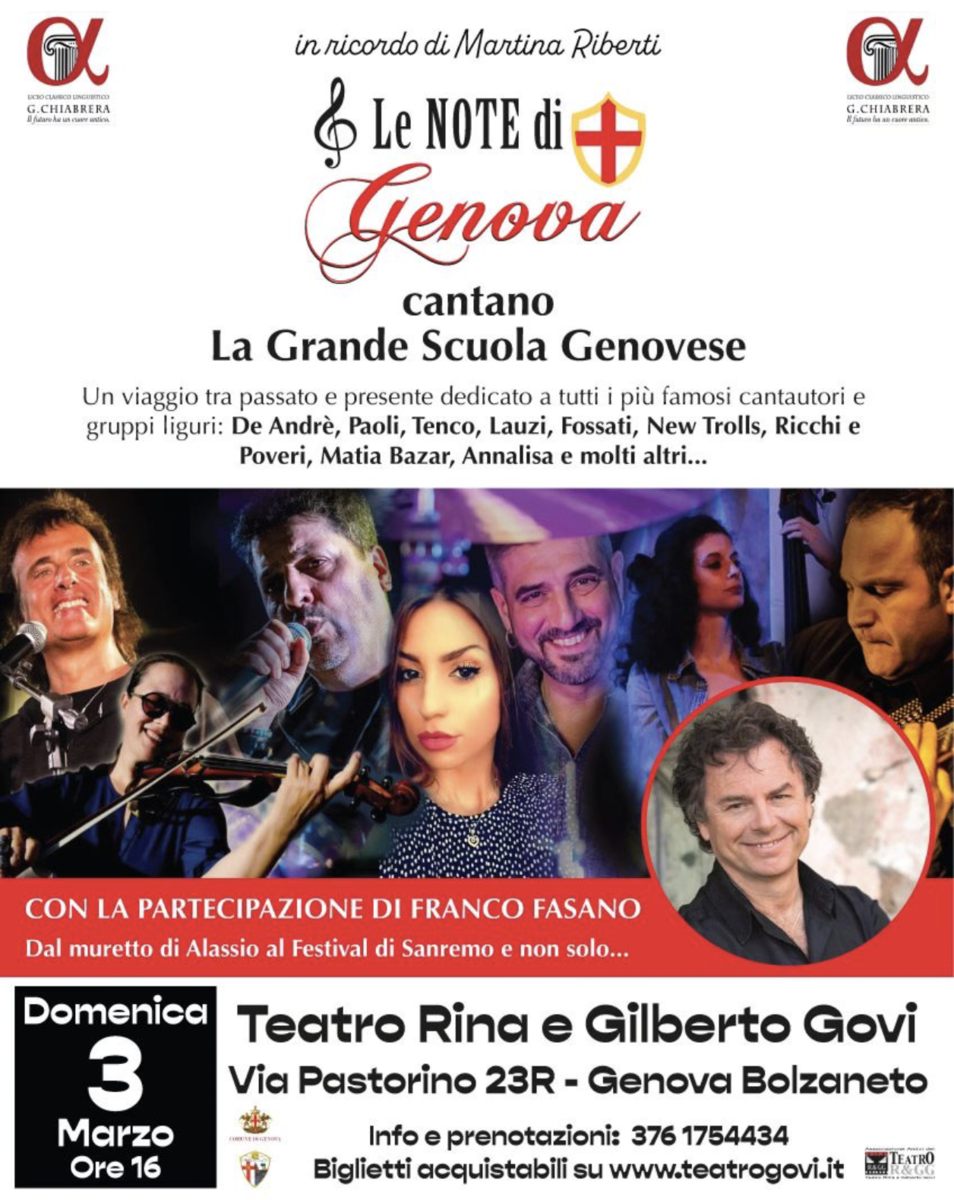 Domenica 3 marzo alle ore 16 presso il Teatro Rina e Gilberto Govi di Genova Bolzaneto le “Note di Genova” saranno in concerto per un viaggio emozionante tra passato e presente, dedicato ai più famosi cantautori e gruppi liguri che hanno scritto pagine importanti della musica italiana. Il gruppo è composto da : Vladimiro Zullo, in arte Vladi, figlio di Pippo, fondatore insieme a Pucci de I Trilli, la cantante Naomi Frontini, la violinista Angela Zapolla,la bassista Valentina Rose, il percussionista Marco Pendola e il chitarrista Gianpaolo Casu.