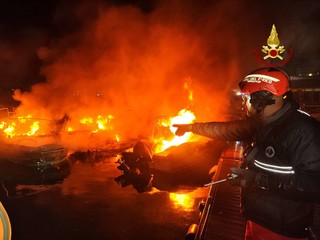Alcune sono affondate. Notte intensa di lavoro per i Vigili del Fuoco. Le fiamme si sono sviluppate in un punto non individuato