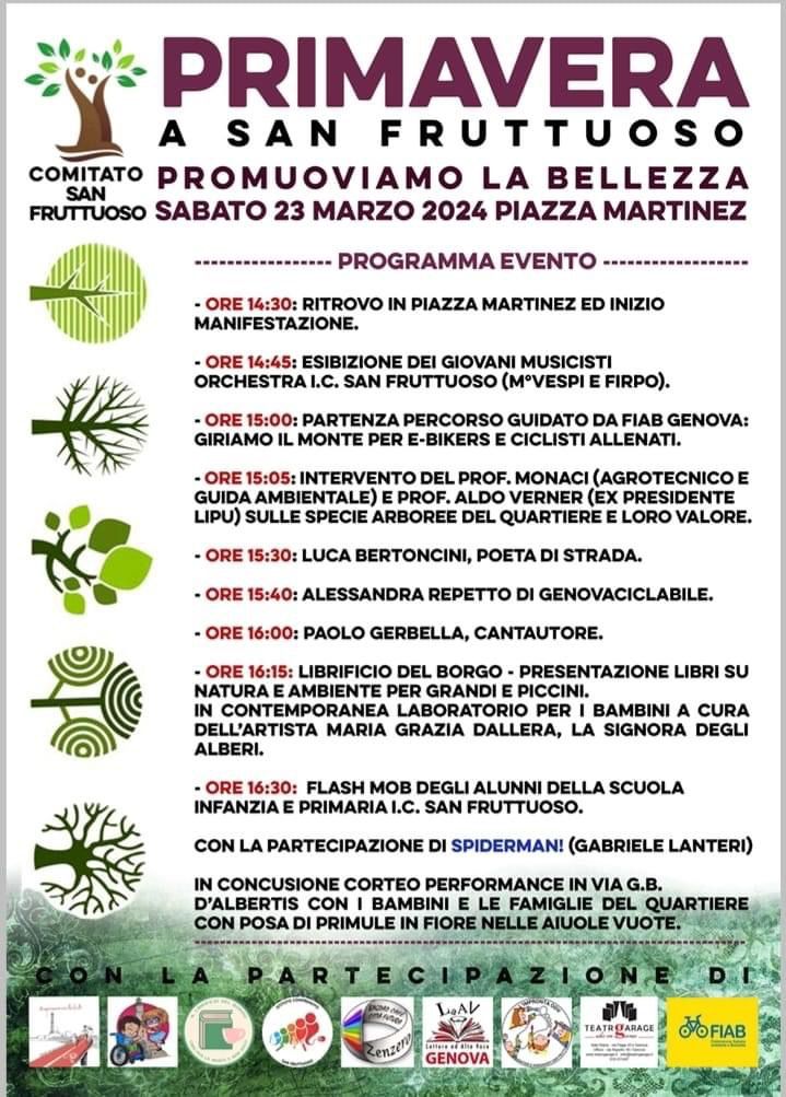 È prevista per oggi, sabato 23 marzo, la prima edizione della Festa di Primavera, organizzata dal Comitato San Fruttuoso: una manifestazione senza bandiere contro il degrado e l'incuria per chiedere tutti insieme un quartiere più pulito e più verde, a misura di bambino. L'appuntamento è per le 14,30 in piazza Martinez, dove artisti e associazioni saranno presenti per sostenere l'iniziativa.