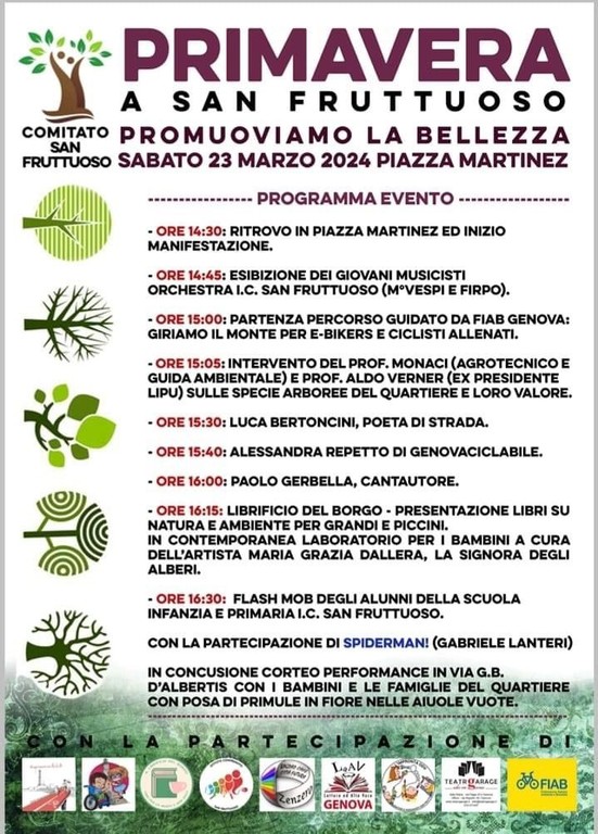 Il programma prevede, come dalla locandina allegata, interventi da parte di esperti del verde, musicisti, artisti, docenti, poeti, giovani orchestrali, associazioni che operano nel sociale e nella cultura, istituzioni scolastiche, la libreria di quartiere e uno Spiderman d'eccezione (Gabriele Lanteri). Al termine degli eventi il corteo di bambini e delle famiglie arrivare in via Contubernio GB D’Albertis per l'abbraccio degli alberi di bagolaro; qui i bimbi della scuola primaria deporranno un vasetto di primule colorate nelle aiuole vuote, proprio dove prima c'erano gli alberi.