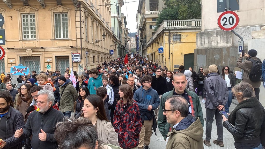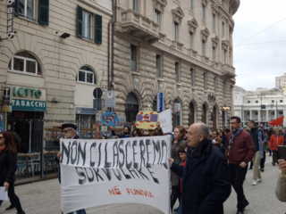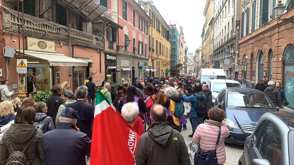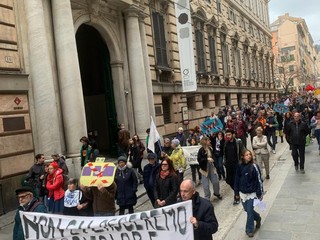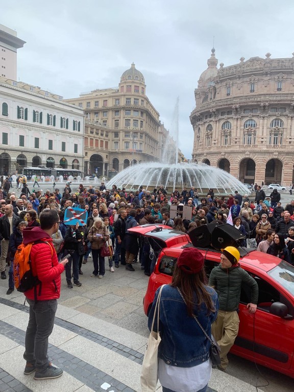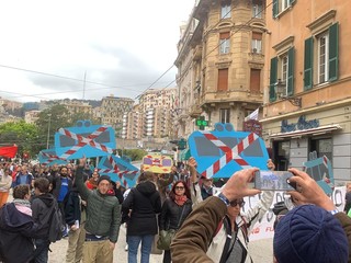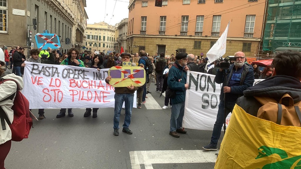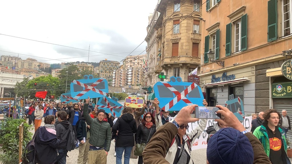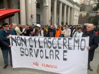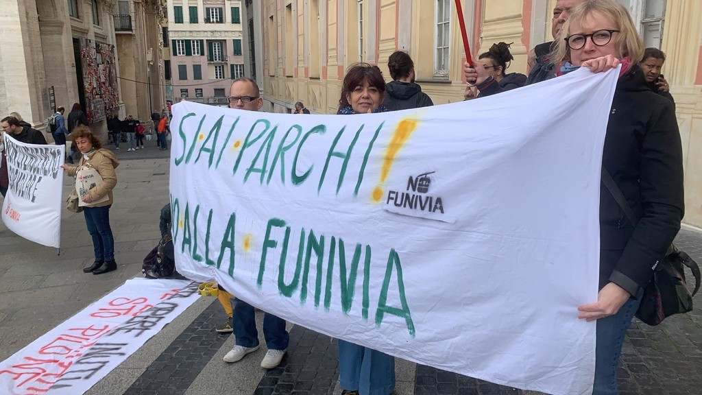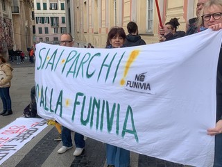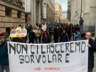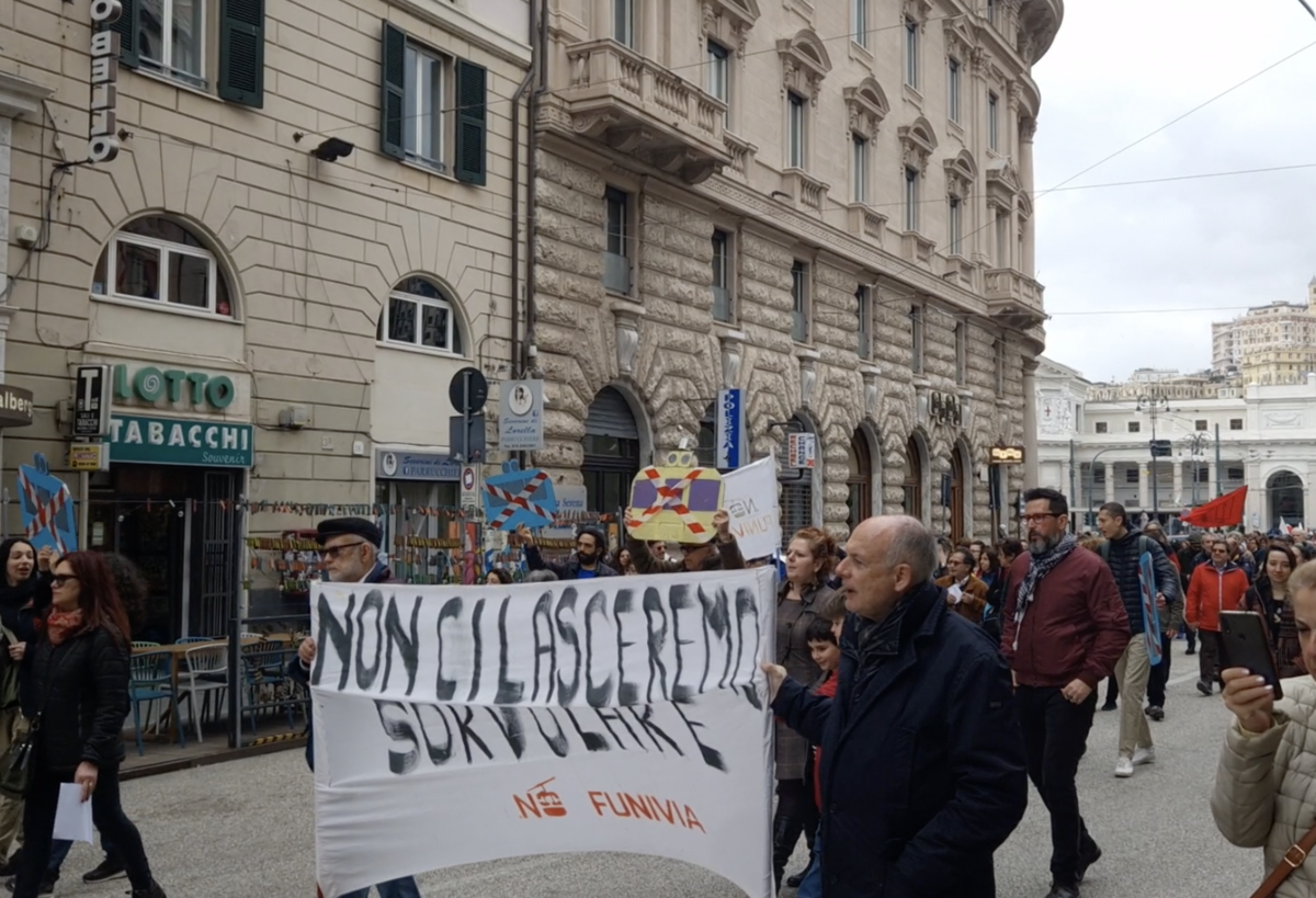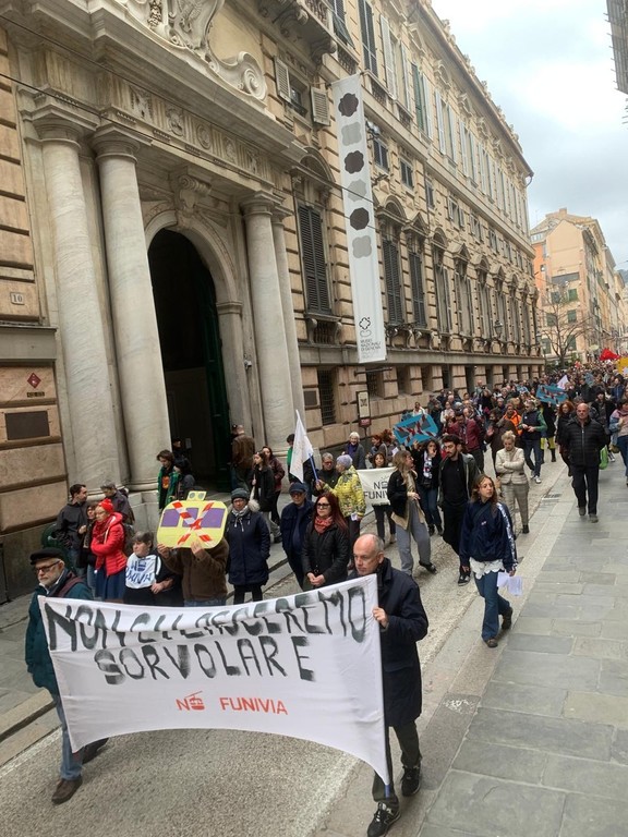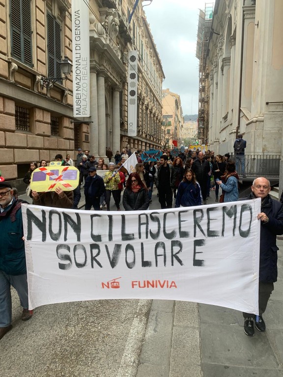Sono circa un migliaio i partecipanti al presidio per ribadire la contrarietà al progetto della funivia che collegherà la Stazione Marittima a Forte Begato. L’appuntamento per i manifestanti era alle ore 10 in stazione a Principe, per poi sfilare in corteo attraversando via Balbi, piazza della Nunziata, via Bensa, piazza Fontane Marose, via XXV Aprile, piazza De Ferrari, con arrivo in Piazza Matteotti.