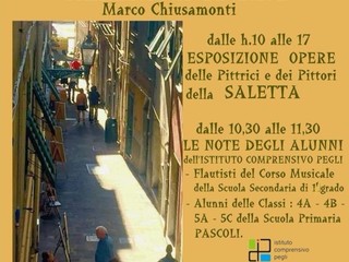 Appuntamento nel ‘caruggio’ (così viene chiamato vico Sinope, per distinguerlo dall’altro vicolo del centro, vico Condino, che invece è la ‘creuza’) dalle ore 10 alle ore 17, con esposizione delle pittrici e dei pittori della saletta: “Saranno in tutto venticinque espositori, una cifra record”, racconta Beppe Bonci, presidente del Club Artistico La Saletta che ha il quartier generale sul lungomare di Pegli e che, con le sue mostre sia personali che collettive, anima mese dopo mese la vita culturale della delegazione.