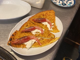 L’intervista è terminata, così come è arrivata alla fine la cottura delle farinate preparate per l’occasione: la versione con le acciughe è pronta per essere servita; quella con la stracciatella e i gamberi viola ha bisogno solamente di qualche istante in più per un impiattamento fatto al momento con cura e passione. Un filo d’olio a crudo dopo aver adagiato gli ingredienti, ed è pronta per essere mangiata, accompagnata dal sorriso di Denis, di Michela e di tutto il loro staff. Buon appetito!