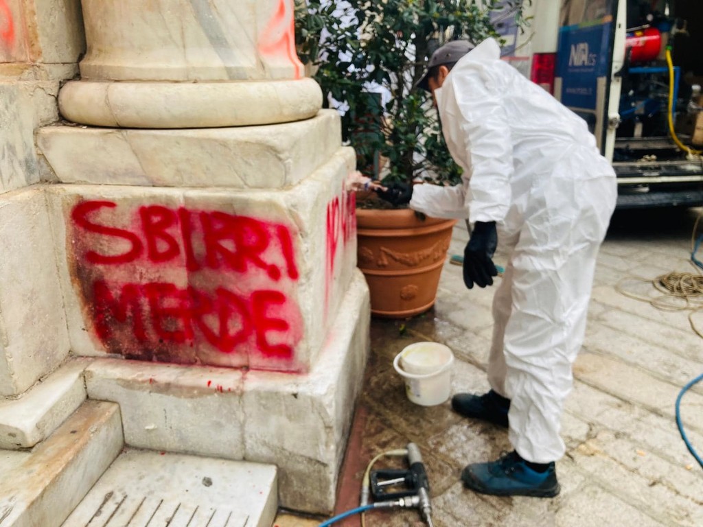 Proseguiranno anche per la giornata di oggi gli interventi di pulitura e rimozione delle scritte lasciate sulle facciate di numerosi edifici del centro dopo il passaggio del corteo in solidarietà degli otto arrestati dopo i fatti venerdì sera nell’Ex Latteria Occupata di stradone Sant’Agostino.