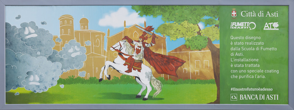 I giovani talenti della Scuola del Fumetto hanno dato vita al pannello con un disegno che rappresenta il Capitano del Palio di Asti, eroicamente in sella al suo cavallo mentre sconfigge le nubi tossiche. Questa immagine simbolica non solo abbellisce la città ma trasmette anche un messaggio potente sull’importanza di proteggere l’ambiente.