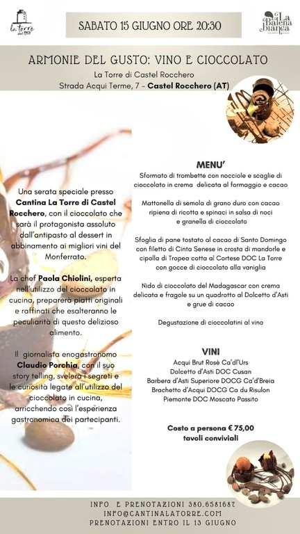 Proseguono le serate a tema della Cantina La Torre di Castel Rocchero, dopo il successo della serata con i fiori eduli, il prossimo appuntamento è previsto per sabato 15 giugno alle ore 20.30 con il Cioccolato, che sarà il protagonista assoluto della cena dall’antipasto al dessert in abbinamento con i migliori vini del territorio. Un appuntamento da non perdere per tutti gli amanti del buon cibo e del buon vino.