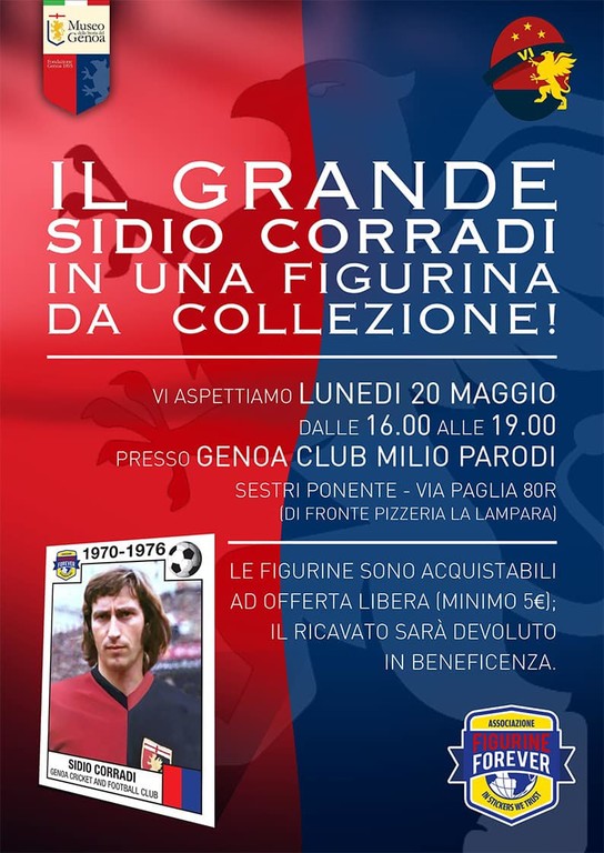 In questa occasione unica gli appassionati avranno l'opportunità di partecipare alla presentazione della figurina solidale Celebrative Stickers n. 78, dedicata appunto al mitico Sidio Corradi in collaborazione con il Museo del Genoa.