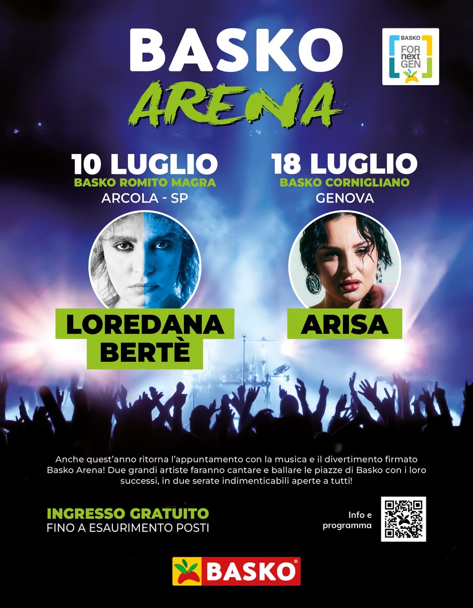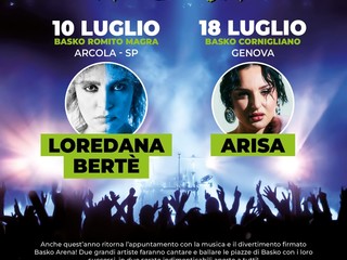 Basko Arena è ormai un appuntamento fisso in agenda per gli abitanti dei quartieri in cui Basko è presente e gli amanti della musica e del sound tutto italiano. A calcare il palco della manifestazione, giunta alla sua 9° edizione, saranno due donne dalla grande energia e molto amate non solo dal pubblico italiano ma anche all’estero. Loredana Berté si esibirà il 10 luglio a Romito Magra, mentre Arisa coinvolgerà il pubblico nella serata del 18 luglio a Genova Cornigliano.