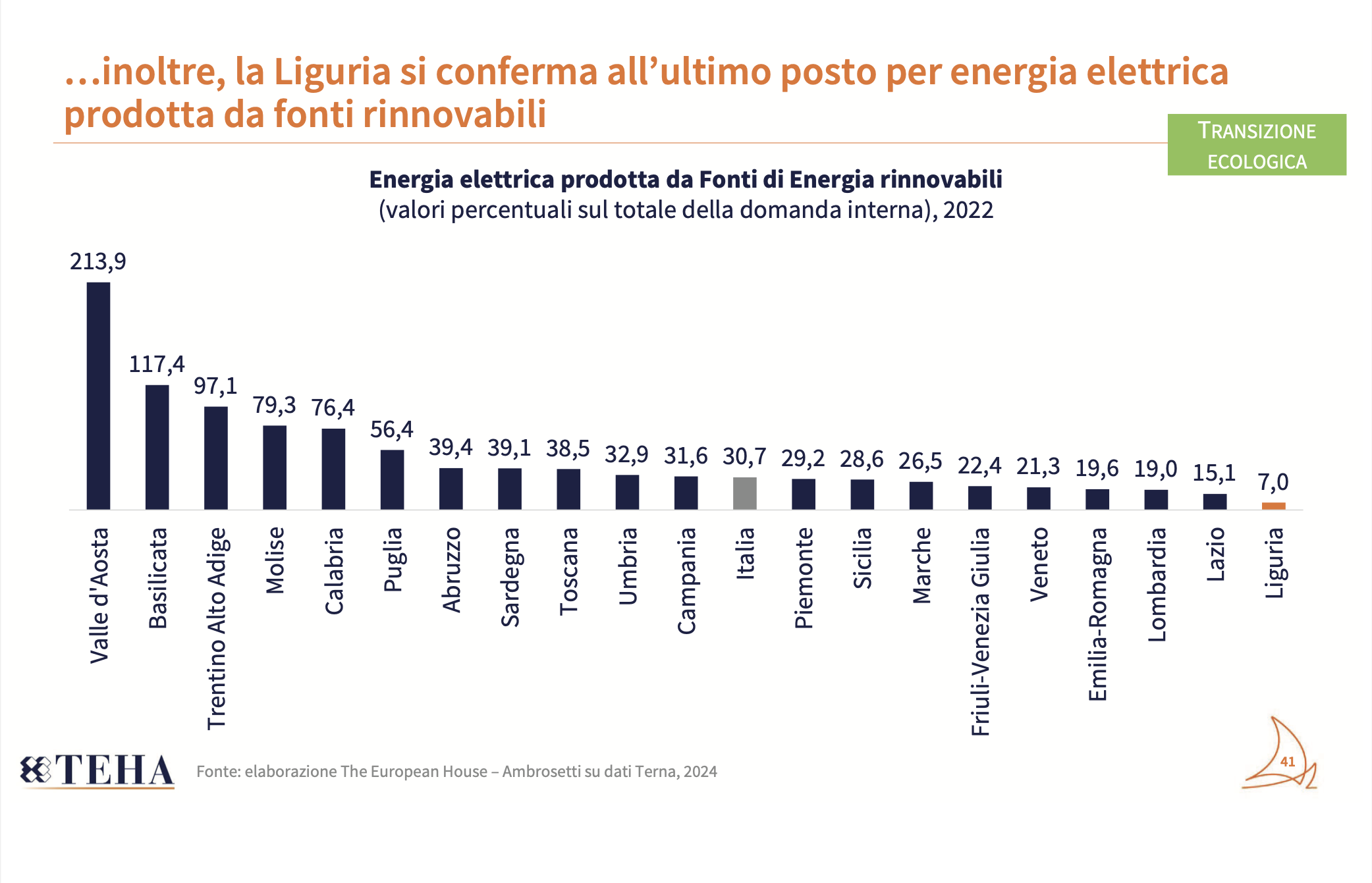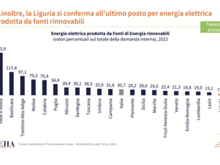 La Liguria, infatti, risulta ultima (e non di poco) tra le regioni italiane per la produzione di energia elettrica da fonti rinnovabili, con solo il 7%, suscitando riflessioni anche sul distacco significativo con la penultima, il Lazio, fermo al 15,1%.
