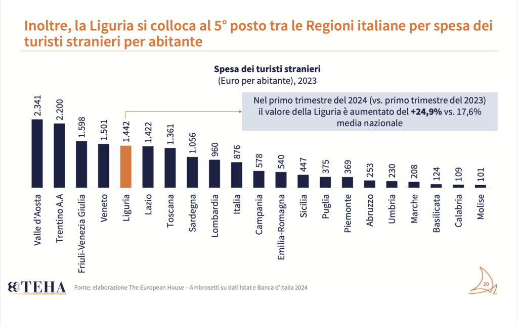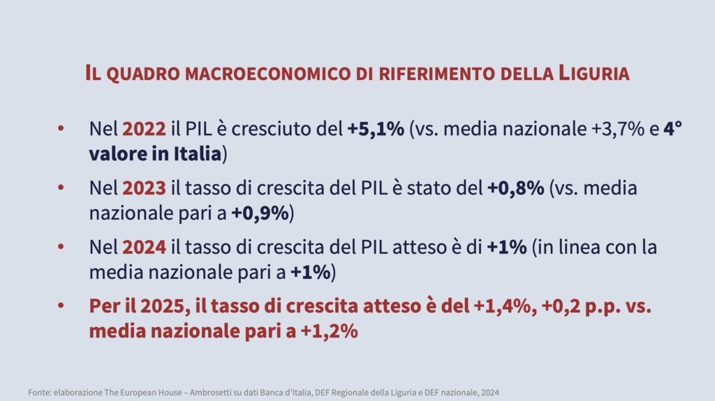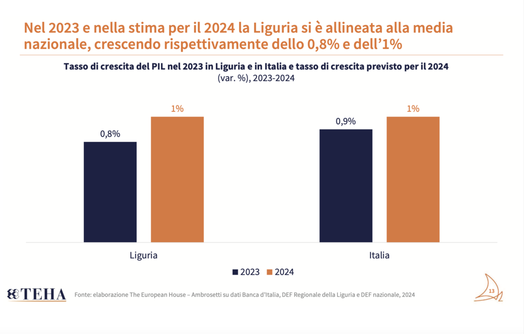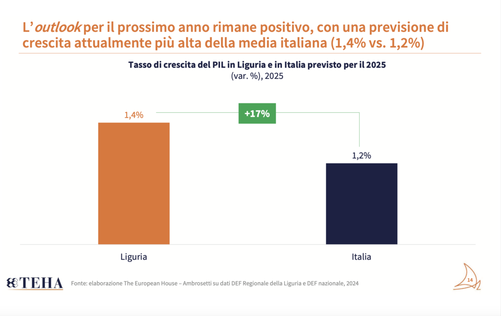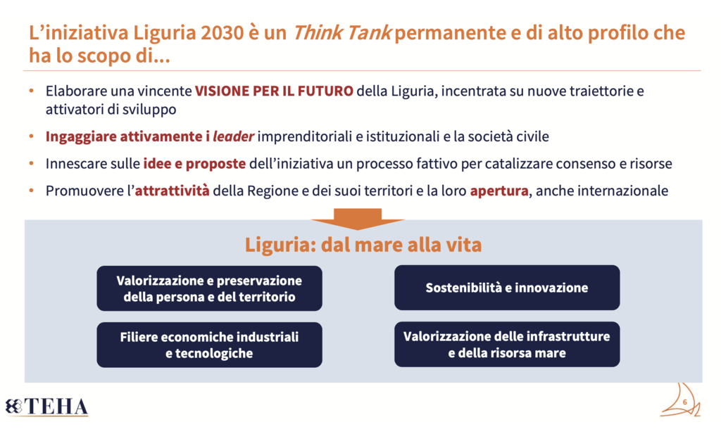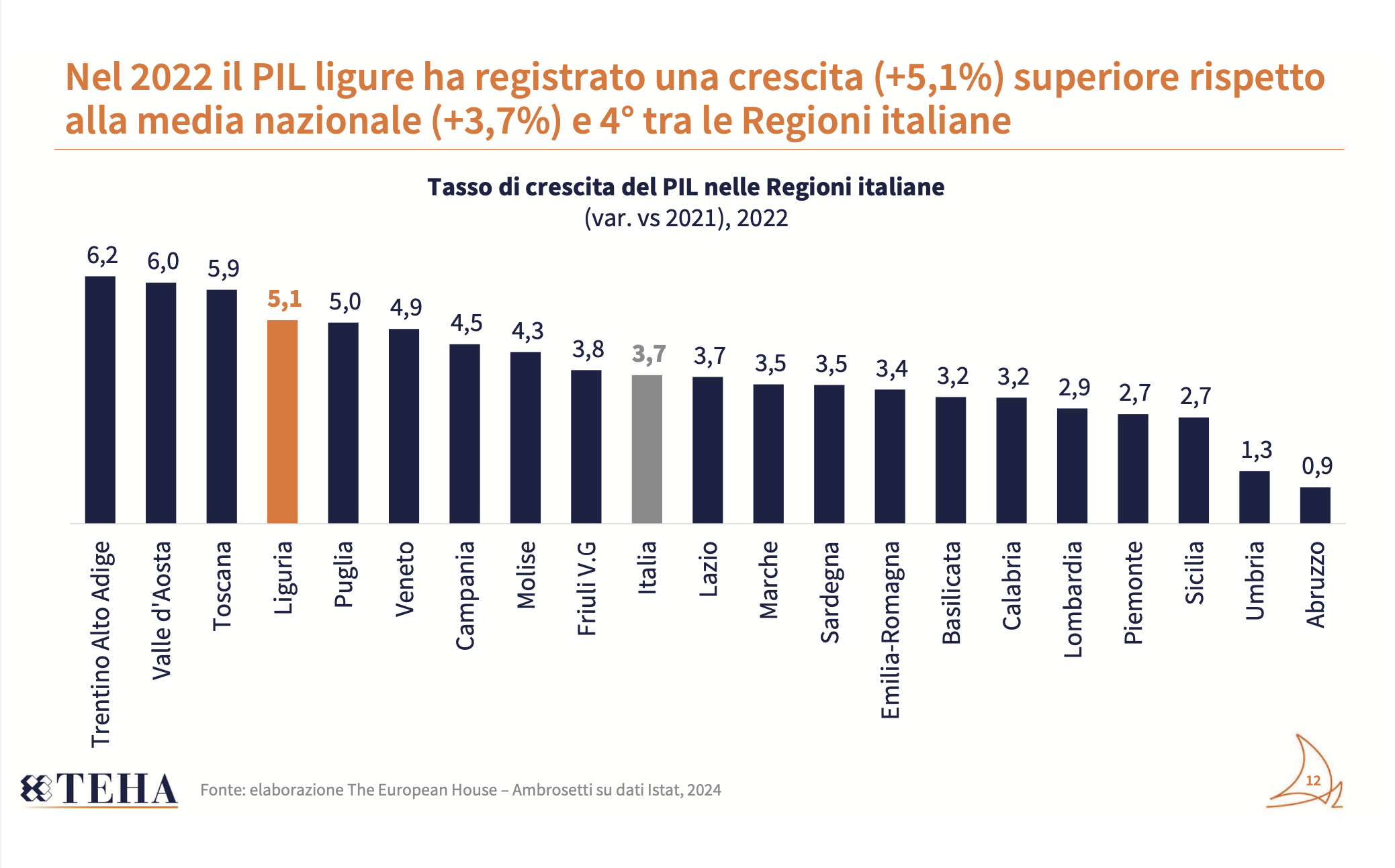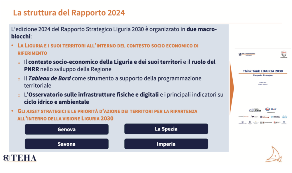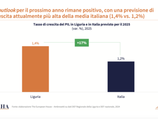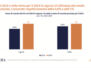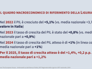 La voce di ‘DoroThea’, l’intelligenza artificiale generativa di The European House - Ambrosetti (TEHA), ha aperto all’Excelsior Palace Hotel di Rapallo la presentazione del Report Think Tank Liguria 2030, il documento che fotografa il momento economico e di sviluppo della Liguria. Il dato cardine, oggetto anche dell’intervento del presidente ad interim Alessandro Piana, vede il PIL 2022 della Liguria in crescita del 5,1%, valore che la colloca al quarto posto nazionale, superiore alla media italiana del +3,7%. Nel 2023 l’Italia è cresciuta dello 0,9%, mentre la Liguria è avanzata dello 0,8%. Nel biennio 2024-2025, invece, si stima una crescita dell’1% (2024) e dell’1,4% (2025), rispetto al 1,2% su scala nazionale.