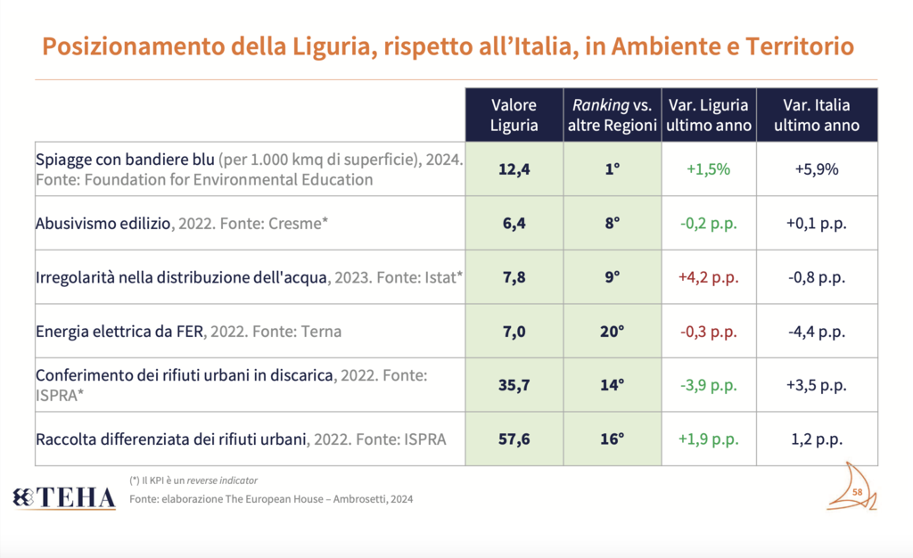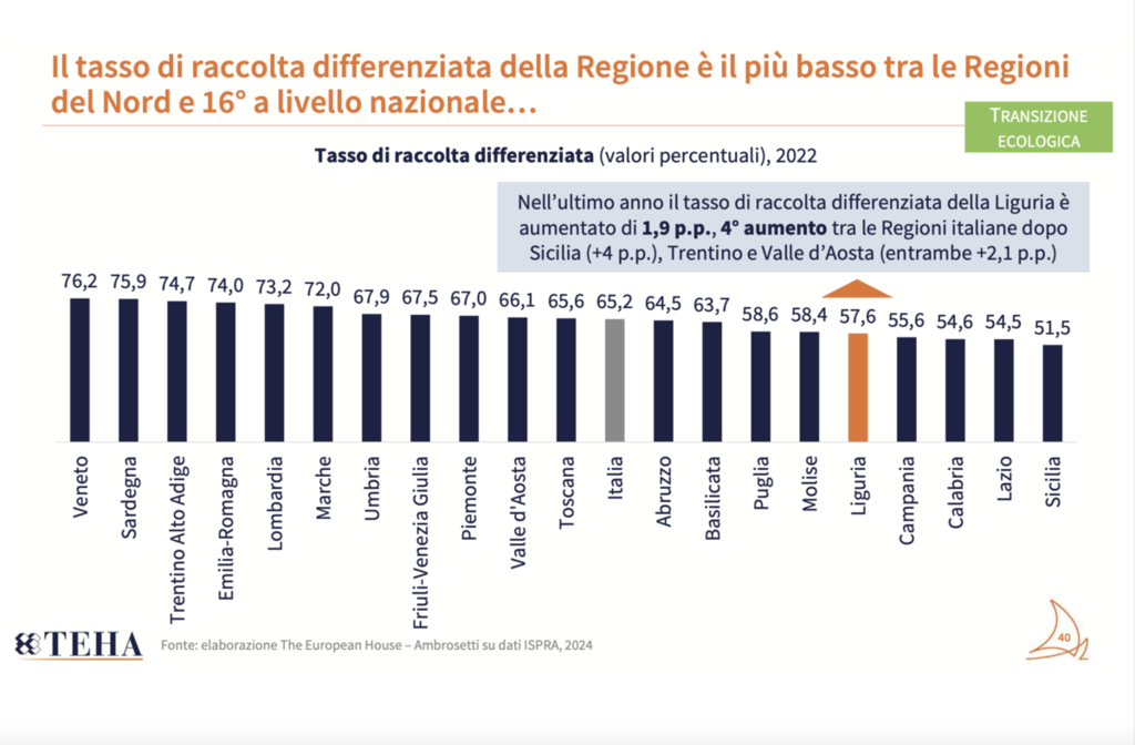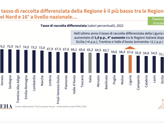 Negativi sono anche i dati sulla raccolta differenziata, che vedono la Liguria al 16° posto con il 57,6%.