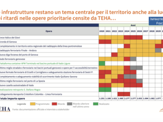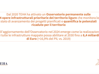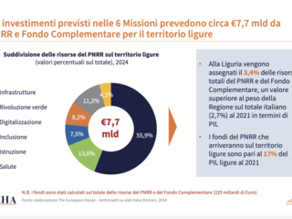 Notizie positive anche per la distribuzione delle risorse del PNRR, che saranno allocate sul territorio ligure entro il 2026 con un valore finale rivisto a 7,7 miliardi di euro (il 3,4% delle risorse). Il finanziamento più consistente (4,4 miliardi) è destinato alla Missione 3 “Infrastrutture per una mobilità sostenibile”, mentre quello meno cospicuo (320 milioni) va alla Missione 6 “Salute”.