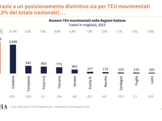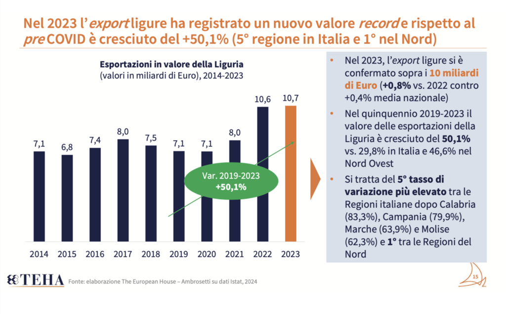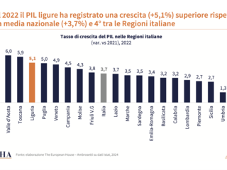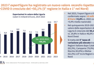 L’export resta una colonna portante dell’economia ligure: nel 2022 è aumentato del 33%, superando i 10 miliardi di euro, per poi raggiungere i 10,7 miliardi nel 2023 con un tasso di crescita doppio rispetto alla media nazionale (+0,8% contro +0,4%). La Liguria si posiziona così al quinto posto nazionale, al primo tra le regioni del Nord.