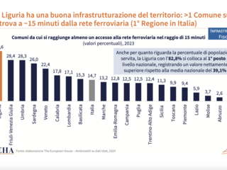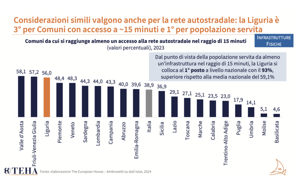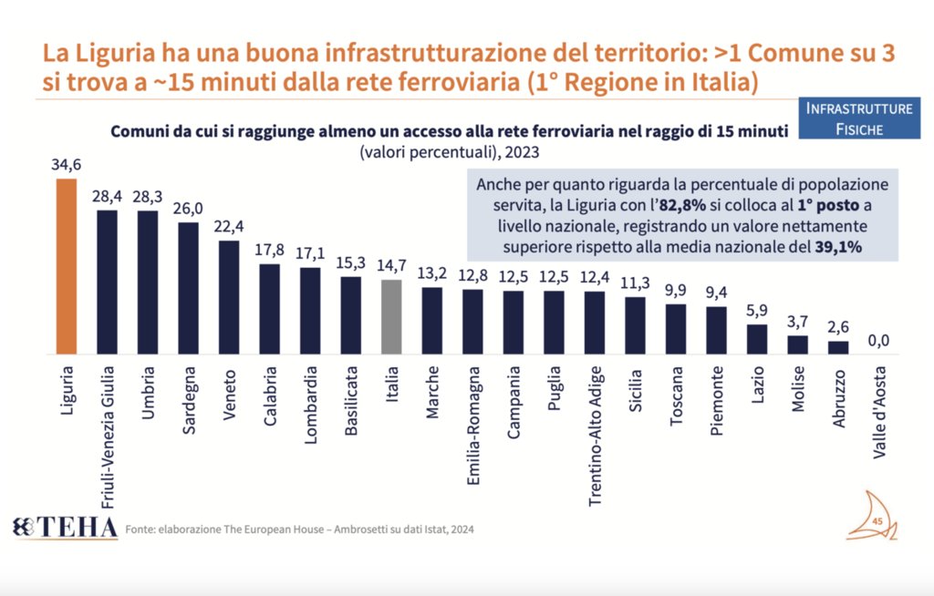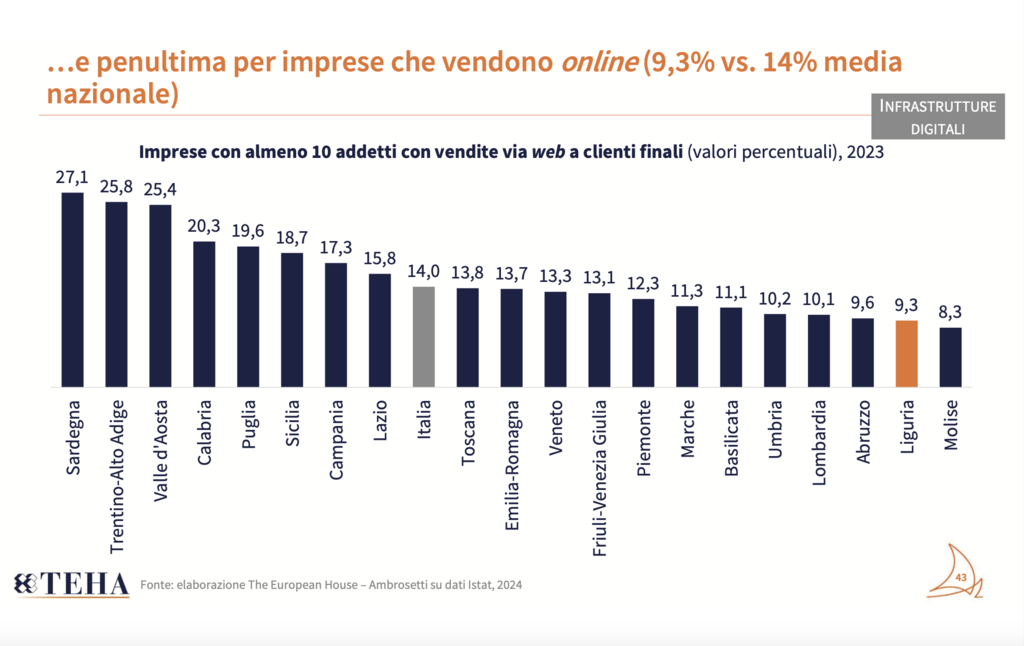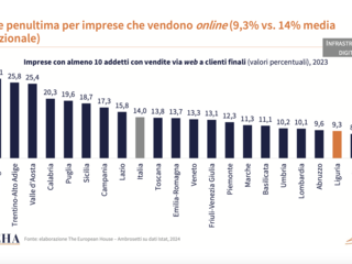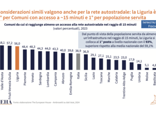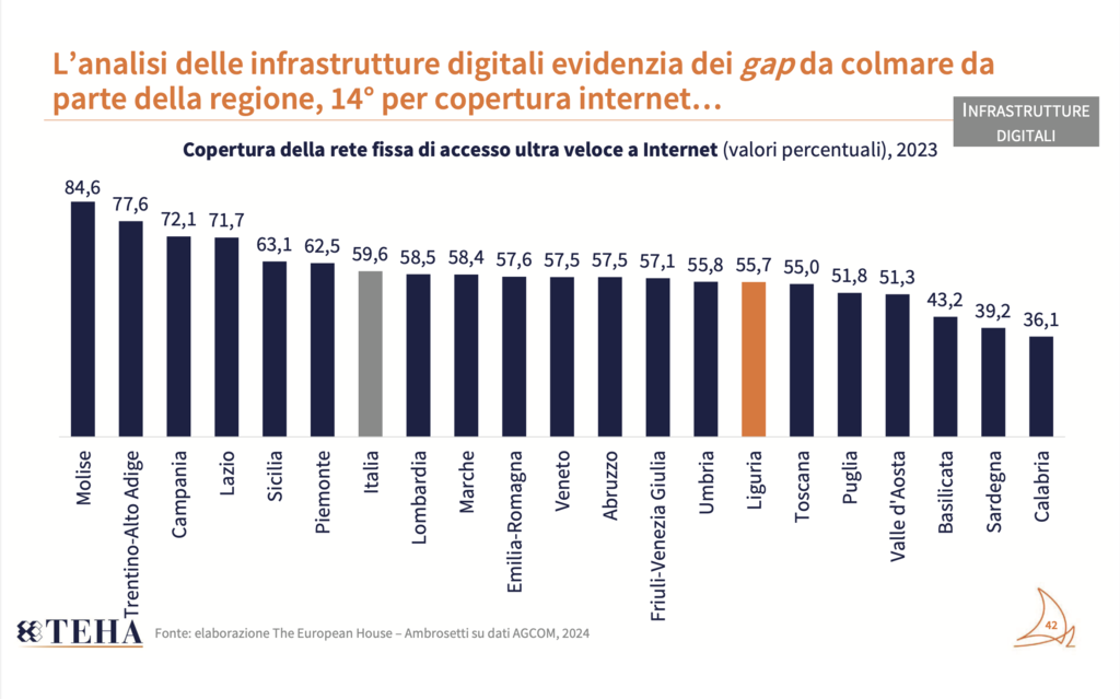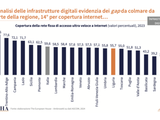 Infine, per quanto riguarda le infrastrutture digitali, la Liguria occupa il 14° posto in Italia con un modesto 55,7% di copertura della rete fissa di accesso ultra veloce a Internet.