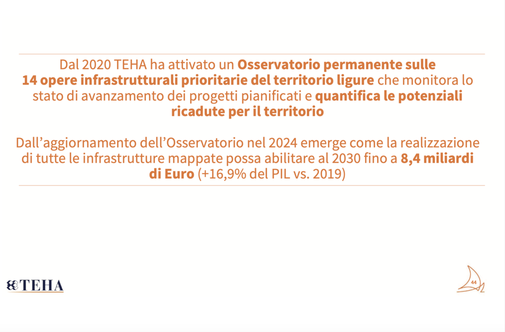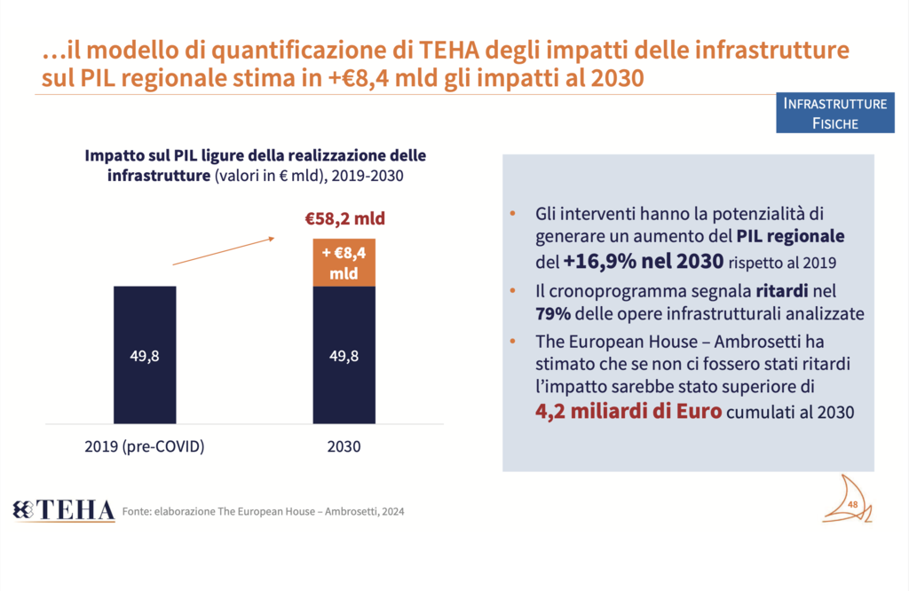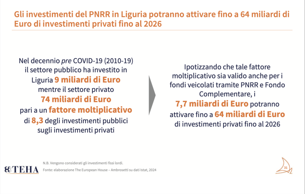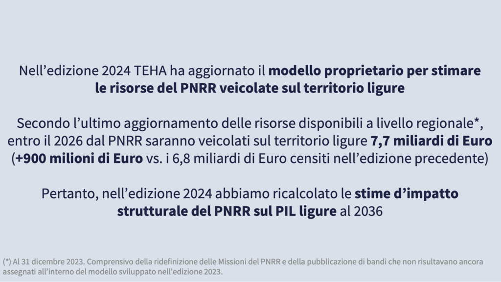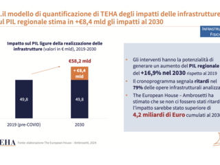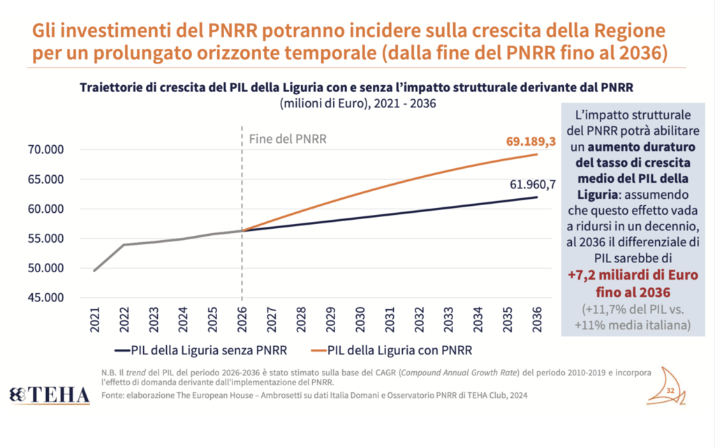 Le ricadute del PNRR sul PIL ligure sono stimate in 7,2 miliardi di euro accumulati entro il 2036 (+11,7% rispetto al 2026).