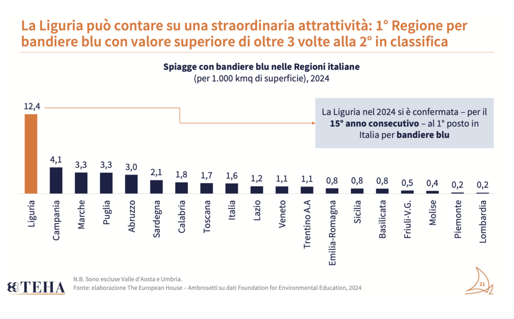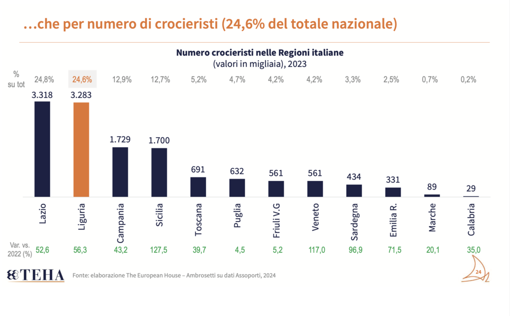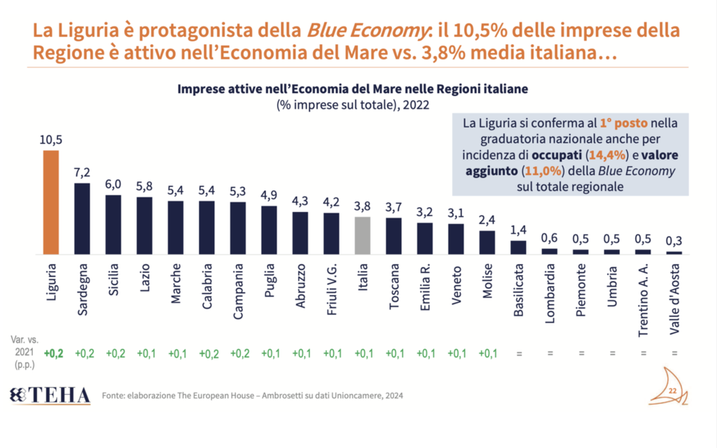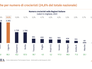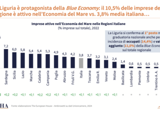 Nel 2022, inoltre, la Liguria è stata la prima regione in Italia per l’incidenza percentuale delle imprese dell’economia del mare: è al primo posto per TEU movimentati (il 34% del totale nazionale) e al secondo per numero di croceristi (24,6% del totale).
