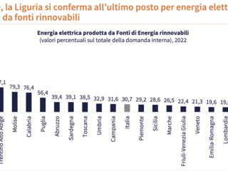 Senza tanti giri di parole, il dato che balza subito all’occhio è il poco onorevole ultimo posto nazionale alla voce “Energia elettrica prodotta da fonti rinnovabili”. La Liguria, con il suo 7%, è da sola e distaccata in coda alla classifica con un netto divario da tutte le altre. Basti pensare che il Lazio, penultimo, arriva al 15,1%. Al primo posto nazionale, invece, c’è l’inarrivabile Valle d’Aosta con il suo 213,9% (valori percentuali sul totale della domanda interna). Praticamente un altro mondo.