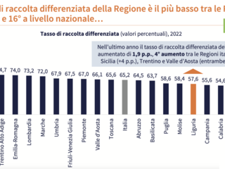 La poca propensione alle tematiche ambientali emerge anche da un altro dato inserito nel report. Siamo alla voce “raccolta differenziata” e qui la Liguria abbandona l’ultimo posto, ma resta sempre in zona retrocessione piazzandosi 16ª e ultima tra le regioni del Nord con il suo 57,6% (dato del 2022). Dietro ci sono solamente Campania (55,6%), Calabria (54,6%), Lazio (54,5%) e Sicilia (51,5%).