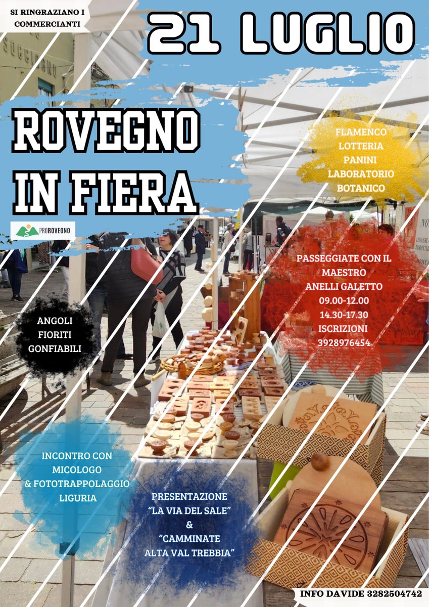 Domenica 21 luglio una giornata ricca di appuntamenti a Rovegno, in alta val Trebbia. Dalle 10 prenderà il via la seconda edizione di “Rovegno in fiera” con oltre 60 stand in tutto il paese: aziende agricole, artigiani, hobbisti, produttori di vino, birra, liquori e non solo. Non mancheranno le attrazioni per i più piccoli con gonfiabili e giochi oltre agli spettacoli della Band degli Orsi, organizzazione no profit da anni al fianco delle famiglie con bambini bisognosi di cure.