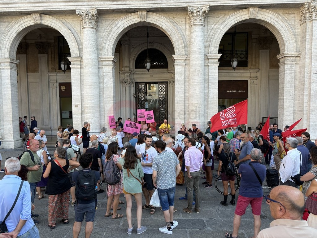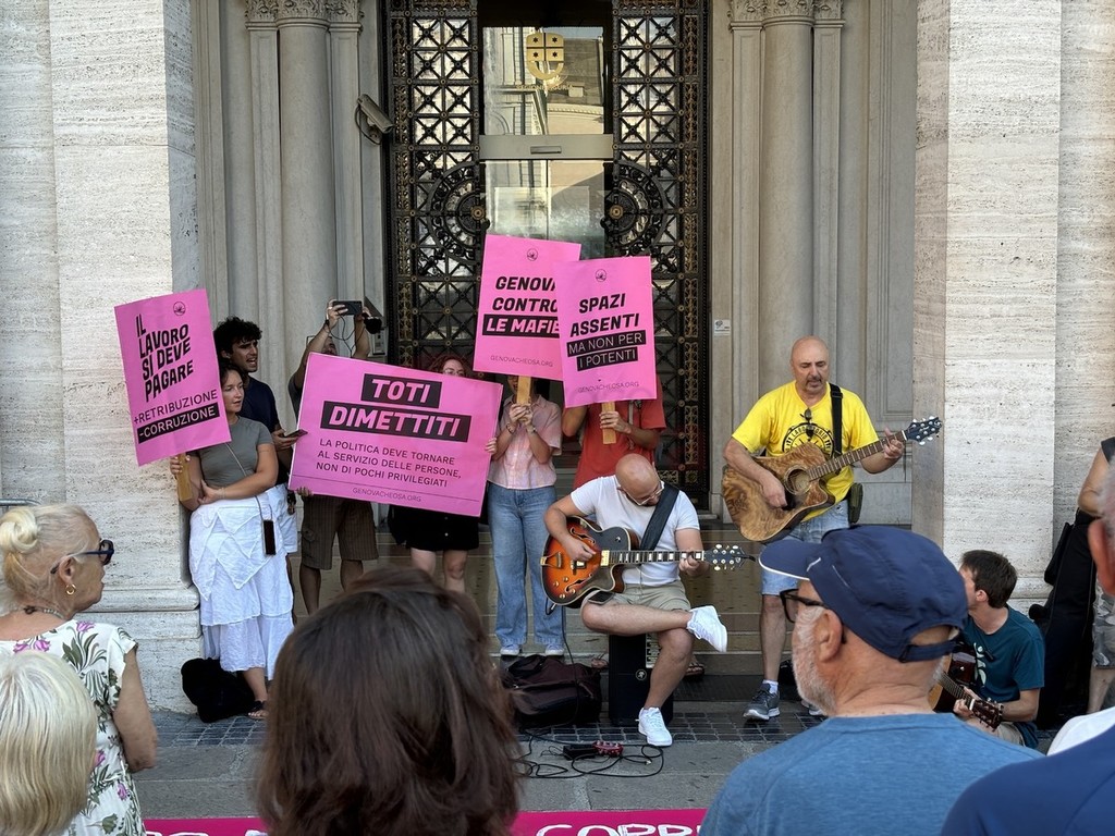 Strumenti alla mano, decine di manifestanti hanno suonato e cantato mostrando cartelli e striscioni contro l’amministrazione regionale e, come ampiamente prevedibile, contro il governatore Giovanni Toti, agli arresti domiciliari dallo scorso 7 maggio con le accuse di corruzione e falso.