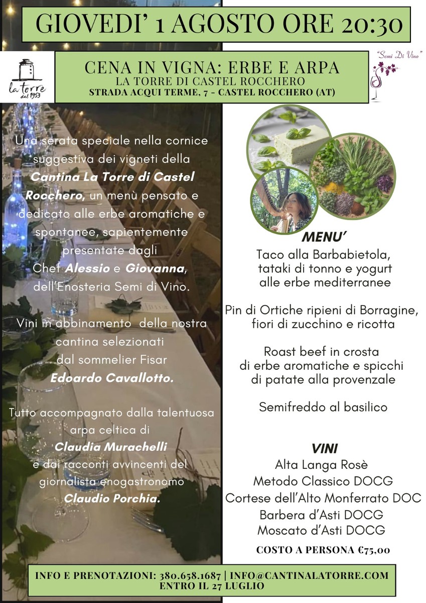 La prima serata sarà dedicata alle erbe aromatiche e spontanee, con piatti curati dagli chef Alessio e Giovanna che si ispirano alla freschezza mediterranea. Il menù, accompagnato dalle melodie all’arpa celtica di Claudia Murachelli e i racconti del giornalista Claudio Porchia, prevede: Taco alla Barbabietola, tataki di tonno e yogurt alle erbe, Plin di Ortiche ripieni di Borragine, Fiori di Zucchino e Ricotta, Roast-beef in Crosta di erbe aromatiche con Spicchi di Patate alla Provenzale, e un Semifreddo al Basilico come dessert. Il sommelier Edoardo Cavallotto ha selezionato i vini da abbinare: Alta Langa Rosè, Cortese dell’Alto Monferrato, Barbera d’Asti, e Moscato d’Asti.
