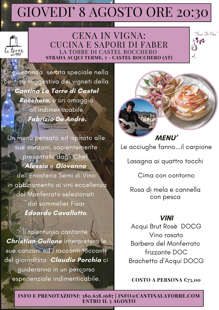 Le sorprese non finiranno qui: nella seconda serata verrà reso omaggio a Fabrizio de André con il cantante Christian Gullone che eseguirà alcune indimenticabili canzoni del cantautore genovese, mentre il giornalista Claudio Porchia parlerà dei riferimenti floreali presenti nelle sue composizioni. Il menù preparato dagli chef Alessio e Giovanna proporrà un viaggio attraverso i sapori e le emozioni delle sue canzoni. Si inizierà con le Acciughe fritte servite su giardiniera della casa, ispirate alla canzone le “Acciughe fanno pallone”, per poi continuare con le Lasagnette al Ragù bianco e la Cima alla Genovese. Per concludere, le Rose di Sfoglia e Pesca con marmellata di rose. Il sommelier Edoardo Cavallotto ha selezionato i seguenti vini per essere serviti in abbinamento: Acqui Brut Rosè Docg, Barbera del Monferrato frizzante Dpc e Brachetto d’Acqui Docg.