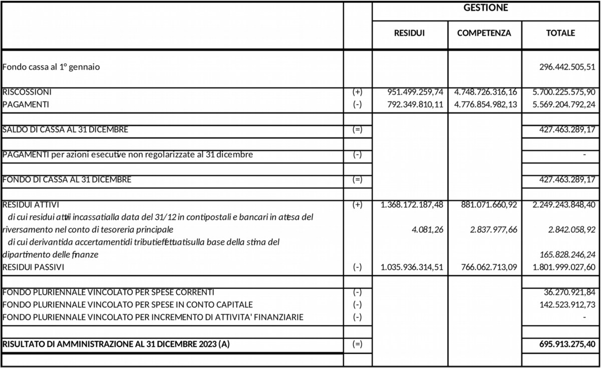 Nelle carte del bilancio emerge che i residui attivi alla chiusura dell'esercizio 2023 ammontano a 2 miliardi e 249 milioni di euro, mentre il saldo attivo per l’esercizio 2023 è di 695.913.275,40 euro, come da schema.