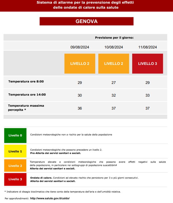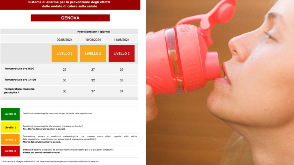 La morsa del caldo sembra non avere alcuna intenzione di allentare la presa: per oggi, venerdì 9 agosto, e domani, sabato 10 agosto, la protezione civile ha previsto il bollino arancione per un’ondata di calore di livello due. Atteso invece per domenica 11 agosto il primo bollino rosso dell’estate 2024, che corrisponde al livello massimo di allerta. La colonnina di mercurio a toccare i 33 gradi, ma la temperatura percepita potrebbe raggiungere anche i 37 gradi. Le raccomandazioni sono, ancora una volta, di uscire nelle ore più calde, di consumare pasti leggeri, di bere molta acqua, e di fare attenzione alla conservazione di cibo e farmaci.