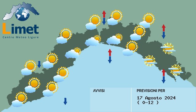 Dalle ore centrali della giornata formazione di nubi cumuliformi sui rilievi interni, nel pomeriggio locali rovesci o temporali associati su Alpi Liguri ed Appennino orientale. Sul resto della regione situazione pressoché invariata con alternanza tra sole ed annuvolamenti.