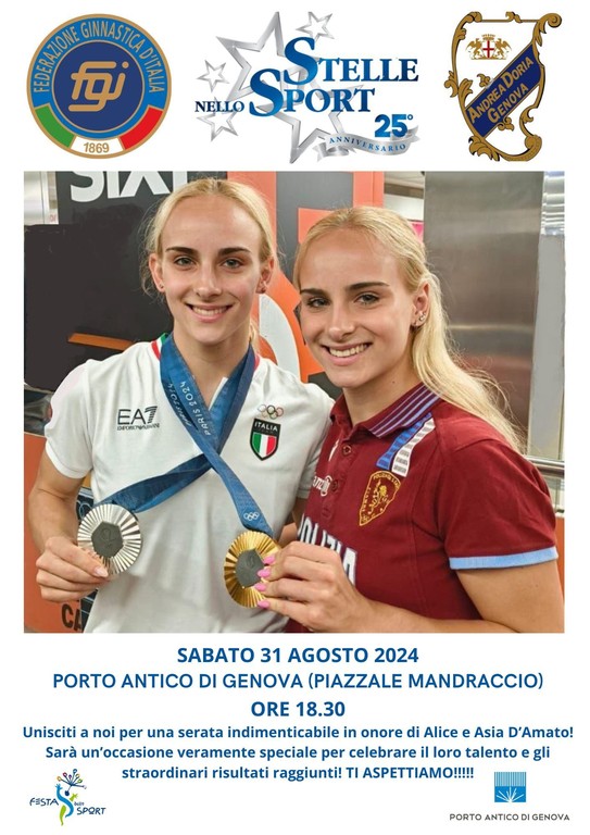 Lo sport genovese e ligure celebra Alice e Asia D'Amato. Appuntamento Sabato 31 agosto (ore 18:30) al Porto Antico di Genova per festeggiare due ragazze straordinarie, due modelli di sportive capaci, con magnifiche performance e risultati straordinari, di ispirare le nuove generazioni della Ginnastica Artistica italiana.