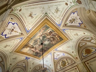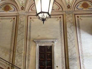 L’atrio, accessibile al pubblico, è separato da vetrate dal triforio: al suo interno si possono ammirare gli affreschi di Ottavio Semino, risalenti agli anni Sessanta del Cinquecento, che raffigura Angelica legata alla rupe con intorno ricche cornici di stucchi e grottesche. Tra i vari custoditi all’interno dell’edificio, l’affresco più importante è situato nel salone del secondo piano nobile, e rappresenta Carlo V impegnato nella battaglia di Muhlberg del il 24 aprile del 1547.