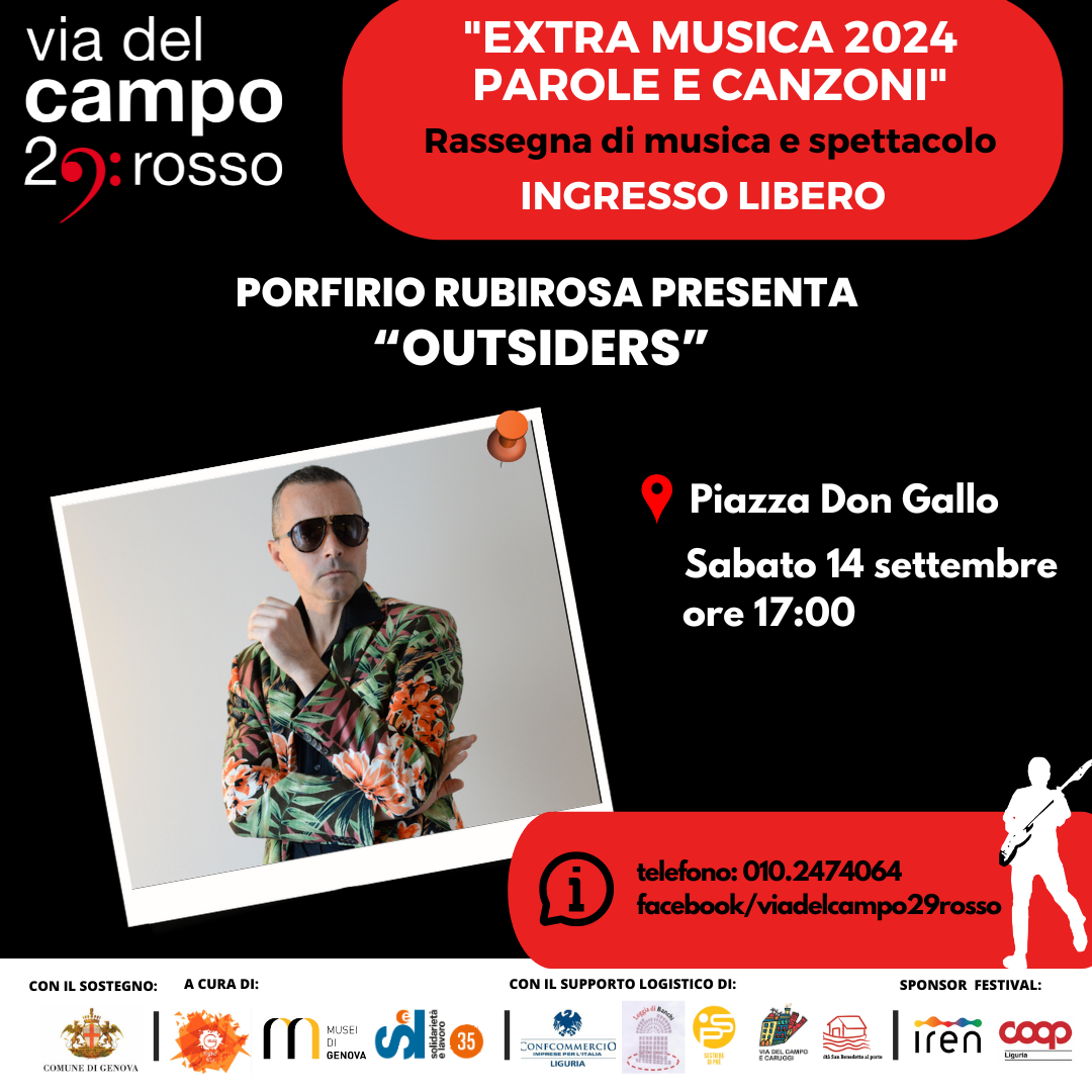 Si conclude sabato 14 settembre alle ore 17:00 con lo spettacolo “Outsiders” di Porfirio Rubirosa, la rassegna ExtraMusica, organizzata da viadelcampo29rosso e Cooperativa Solidarietà e Lavoro, nell’ambito delle iniziative di Genova Città dei Festival 2024.