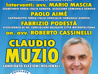 Domani pomeriggio, sabato 5 ottobre, alle ore 18.15 a Casarza Ligure, presso l’auditorium di Villa Sottanis in via Annuti 36, avrà luogo la presentazione al pubblico della candidatura di Claudio Muzio al Consiglio Regionale, sotto le insegne di Forza Italia di cui è capogruppo dal 2020, e a sostegno del candidato presidente Marco Bucci. Interverranno, oltre a Muzio: Mario Mascia, segretario cittadino di Forza Italia a Genova, Paolo Aimé, capogruppo azzurro in Consiglio comunale a Genova, Fabrizio Podestà, consigliere delegato di Città Metropolitana e vicesindaco di Ne e l’on. Roberto Cassinelli. In apertura i saluti di Mirella Biasotti, vicesindaco di Casarza Ligure.