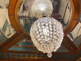 In fondo, una porticina sapientemente camuffata da decorazioni e specchi porta al retrobottega mentre dall’alto, quattro lampadari a goccia illuminano il piccolo ambiente creando un gioco di luci che muove lo spazio.