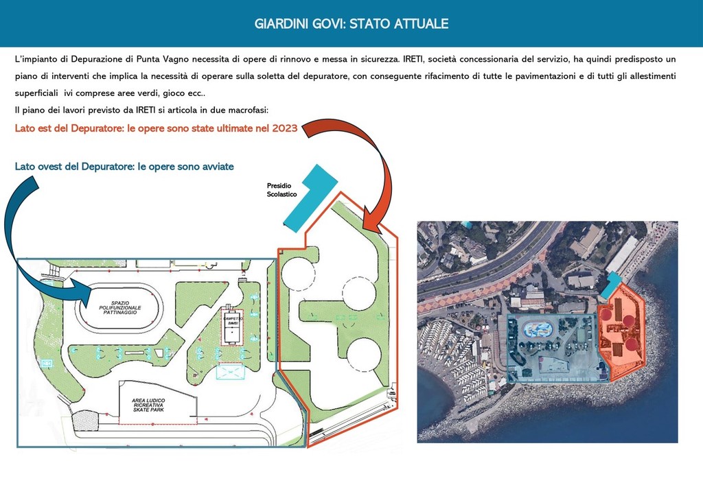 “La notizia della privatizzazione dei Giardini Govi nel quartiere della Foce va ascritta al novero delle fake news elettorali ed è già a livello tecnico, prima che politico, destituita di ogni fondamento. In corrispondenza con le opere di rinnovo e messa in sicurezza dell'impianto di depurazione di Punta Vagno, la società concessionaria del servizio IRETI, partecipata pubblica, ha giocoforza dovuto mettere mano alla soletta del depuratore stesso, con una serie di interventi che, nel lotto di Levante, sono stati ultimati nel 2023, mentre, nel lotto di Ponente, contemplano il rifacimento di tutte le pavimentazioni e di tutti gli allestimenti superficiali delle aree verdi. Tali lavori verranno realizzati in modo da recepire le indicazioni pervenuteci dal Municipio Medio Levante, riservando spazi ad hoc per l'inserimento di funzioni a servizio della pubblica fruibilità, campo da calcetto incluso. Il progetto in effetti lascia campo libero a un nuovo skate park, a un campetto da calcio analogo a quello da sempre presente in loco, ad un'area giochi per bambini, ad un'area fitness, a spazi ombreggiati per il relax e la socialità, oltre che alla realizzazione di servizi igienici". Lo annuncia l'assessore all'Urbanistica del Comune di Genova Mario Mascia in merito ai lavori di risistemazione dei Giardini Govi da parte di IRETI.