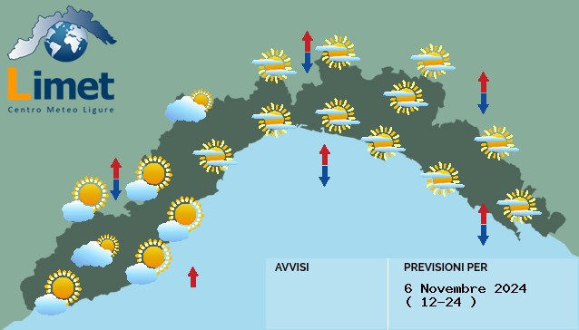 In mattinata cieli parzialmente nuvolosi per nuvolosità medio-alta stratificata sul centro-levante della regione, con possibili addensamenti più consistenti sull’Imperiese occidentale. Cieli offuscati sulle vallate savonesi e genovesi esposte al travaso nelle prime ore mattutine. Banchi di nebbia sui versanti padani con una maggiore insistenza di questi ultimi sulle zone limitrofe alle pianure del basso Piemonte localmente anche nelle ore diurne. Cieli sereni o parzialmente velati sui restanti settori.