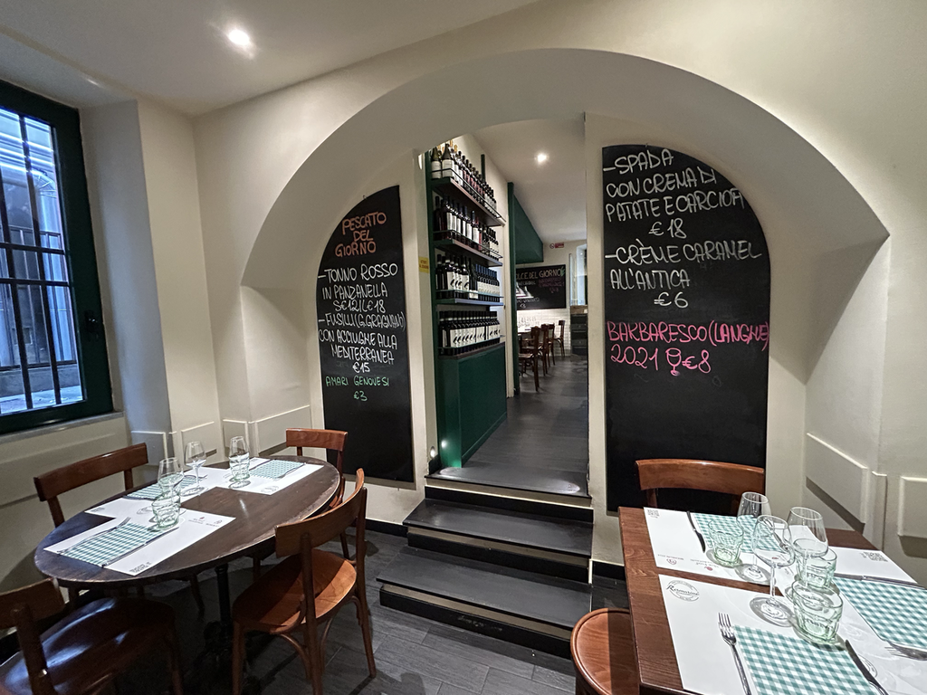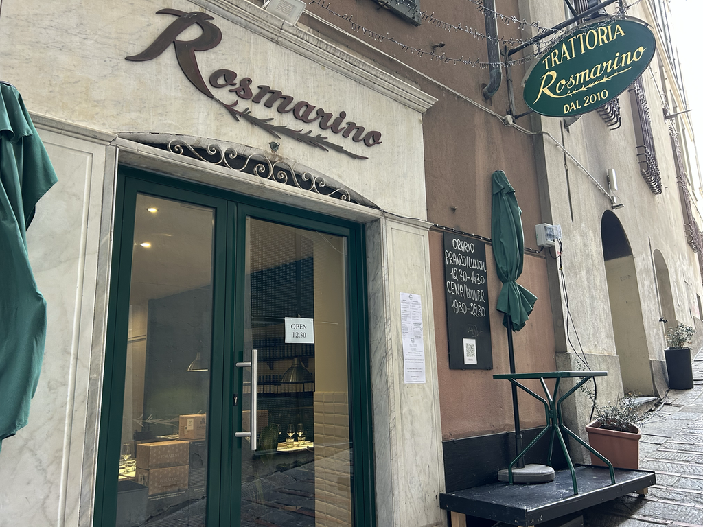 "A pochi metri da piazza De Ferrari, tavoli all'aperto e una piacevole ed informale atmosfera nelle tre sale interne. Ecco il Rosmarino, dove su tutto trionfa la qualità della cucina: un'intelligente proposta di classici liguri, sia di carne che di pesce, sorretta da ottimi ingredienti. Imperdibile il baccalà 'brandacujun', ma anche i raviolini di borragine al tocco e la trippa alla 'sbira'".