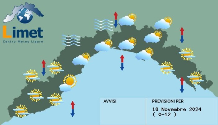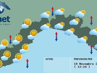 Nuvolosità medio-alta in mattinata su tutta la regione con qualche possibile cumulo di macaia sul settore costiero del Genovesato e dello Spezzino. Possibili banchi di nebbia alle prime ore del mattino sui versanti padani. Durante il pomeriggio aumento della nuvolosità sul Centro-Levante, ove non si escludono brevi piovaschi. Rasserenamenti possibili sull’estremo ponente.