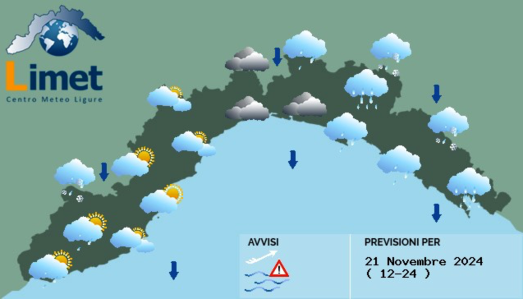 Al mattino cieli prevalentemente velati su tutta la regione; dal pomeriggio rapido aumento della nuvolosità, con precipitazioni localmente intense sull’Appennino di Levante, dove saranno possibili fiocchi di neve oltre i 1000-1200m.