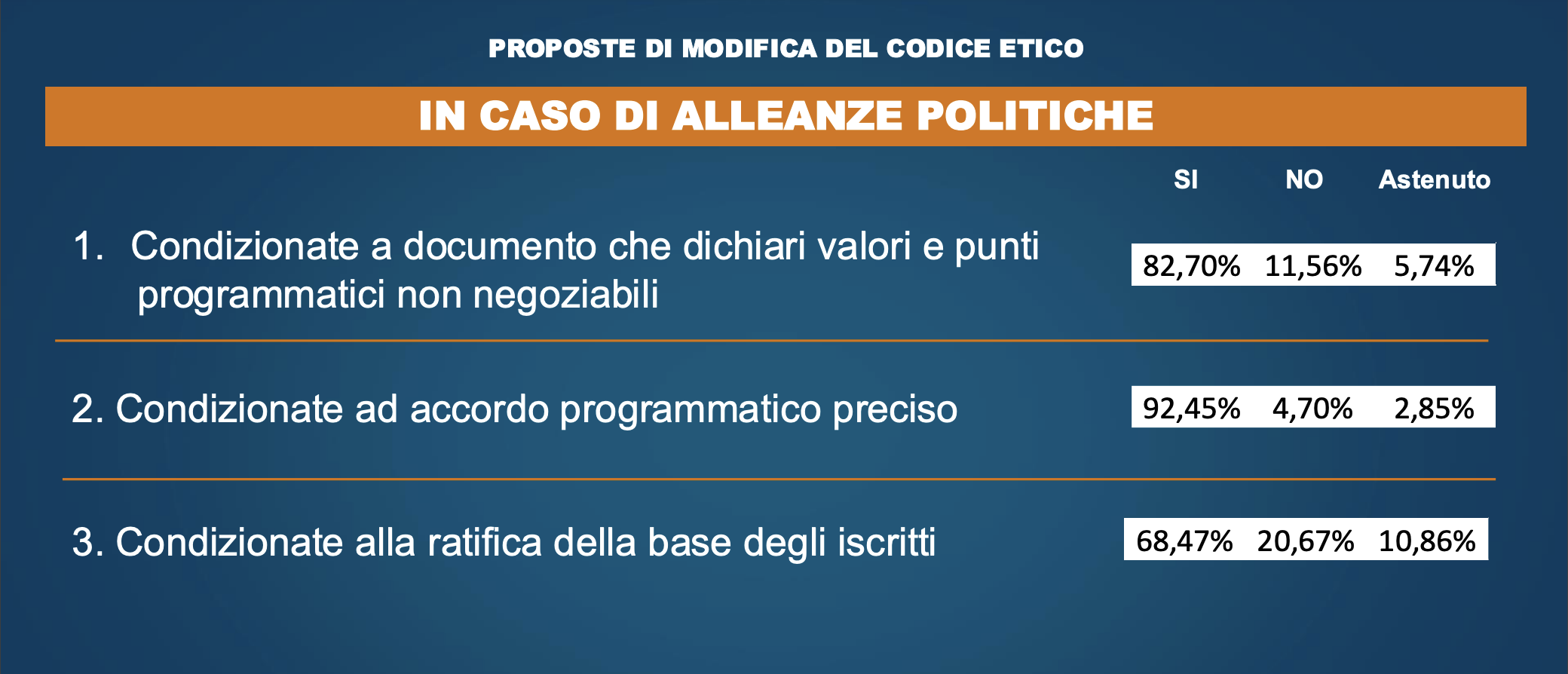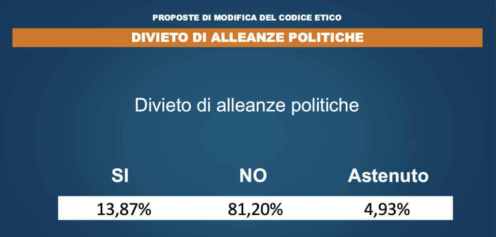 L’81,2% ha detto “no” al divieto di allearsi con altre forze politiche, ma la stragrande maggioranza dei votanti ha anche detto “sì” ad alleanze “condizionate a un documento che dichiari valori e punti programmatici non negoziabili”, “condizionate ad accordo programmatico preciso” e “condizionate alla ratifica della base degli iscritti”.