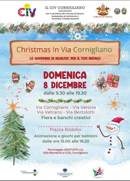 Nel medesimo giorno Cornigliano non solo vedrà la via principale animarsi in prossimità delle festività, ma è stato programmato dal Civ anche un evento speciale, che proporrà al pubblico una fiera e diversi banchi creativi (alimentari, abbigliamento, articoli per Natale e tanto altro) disponibili al pubblico a partire dalle ore 9.30 fino alle 19.30, organizzata lungo le seguenti vie: via Cornigliano, via Verona, via Vetrano e via Bertolotti. Inoltre, per i più piccini, sarà previsto in piazza Rizzoli alle 15.30 un incontro di animazione e giochi, dove ad attenderli ci saranno i controllori del fantastico Polar Express (parcheggio gratuito disponibile presso CGIL Cornigliano e Villa Bombrini).