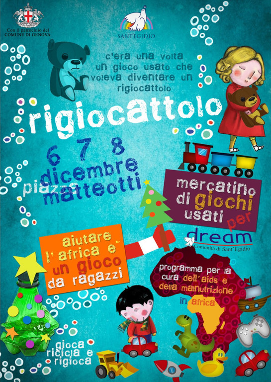 Dal 6 all’8 dicembre, piazza Matteotti ospiterà la nuova edizione del Rigiocattolo, la mostra-mercato di giochi usati organizzata dai Giovani per la Pace, il movimento giovanile della Comunità di Sant’Egidio. Per tre giorni, studenti liceali e universitari animeranno il mercatino, dove saranno esposti giocattoli donati dai bambini genovesi e rimessi a nuovo dai volontari.