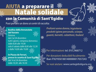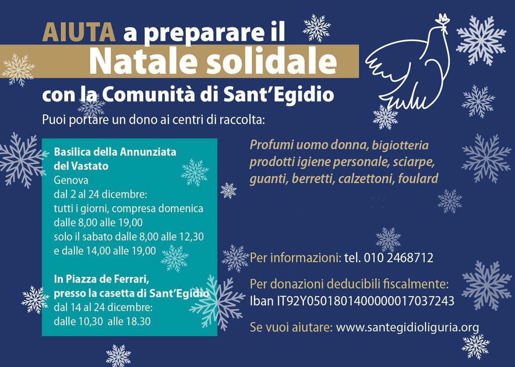 La comunità raccoglie regali nuovi, utili per gli ospiti: sciarpe, guanti, cappelli, profumi, prodotti di cosmesi, giocattoli, tavolette di cioccolato e dolci natalizi. Numerosi punti di raccolta sono attivi in città, dalla Basilica della SS. Annunziata alla casetta di Sant’Egidio in piazza De Ferrari, oltre a sedi nei vari quartieri genovesi.