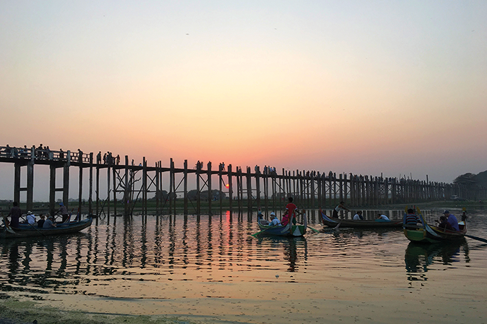 Mandalay, una città che non colpisce subito per la sua bellezza, ma che mi ha regalato scorci inaspettati. Ho visitato il ponte U Bein, il ponte in teak più lungo del mondo, al tramonto, quando la luce del sole si rifletteva sull’acqua creando un’atmosfera unica. Qui ho visto la vita scorrere nella sua semplicità: monaci in cammino, bambini che giocavano, anziani che si fermavano a parlare.