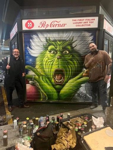 “Web3 è il secondo artista che lascia il suo segno sulle saracinesche del Pop Corner di via Turati – racconta Piano –. Il primo è stato Jo-Shen2, che ha anche decorato la serranda del nostro corner-laboratorio in via Granello, un’altra edicola che ho riportato in vita”. Il progetto di Piano prevede infatti che le opere siano temporanee: “Il disegno di Jo-Shen2 è rimasto sei mesi su questa serranda, e così farà il Grinch di Web3. Dopo altri sei mesi, daremo spazio a un nuovo artista per offrire visibilità ai talenti emergenti di questo filone artistico”.