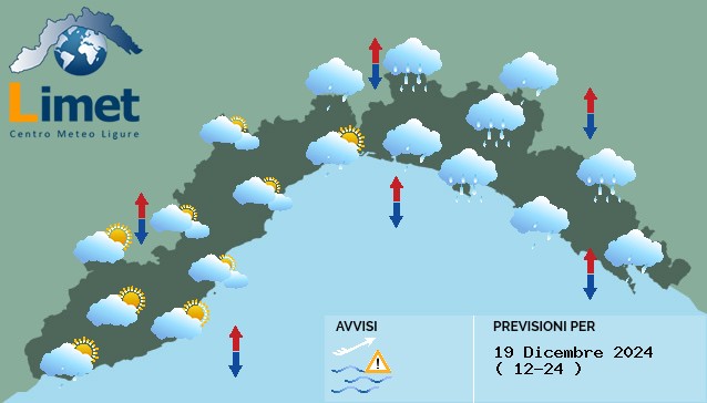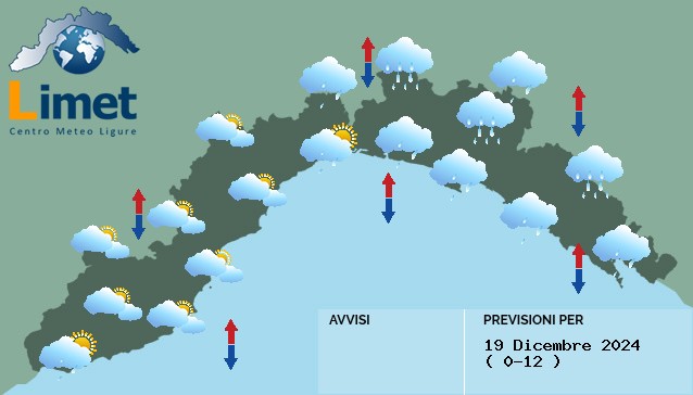 Sul settore centro-orientale cielo molto nuvoloso con rischio di rovesci più probabili da Genova verso Levante e con massimi effetti nelle aree interne. Fenomeni più probabili nel pomeriggio e nella prima parte della sera. A Ponente cielo nuvoloso, ma con basso rischio di pioggia a parte qualche piovasco su Arenzanese, Varazzino ed estremo imperiese.