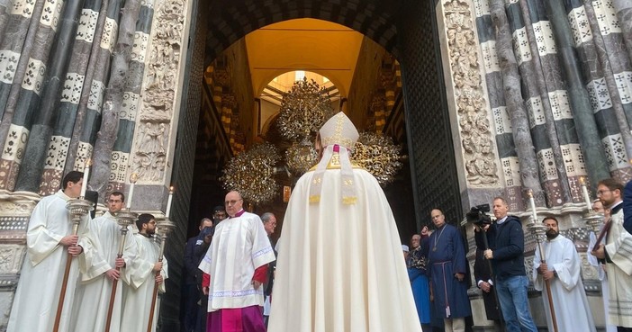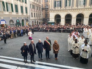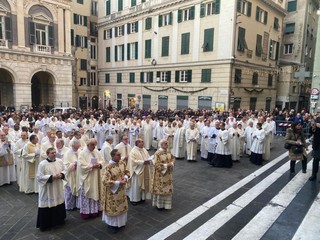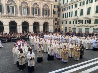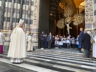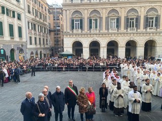 È iniziata alle 15,30 nella Cattedrale di San Lorenzo la celebrazione della santa Eucarestia come solenne apertura dell’Anno giubilare secondo le indicazioni date dal Dicastero per il culto divino e la disciplina dei sacramenti. La cerimonia è iniziata nella Chiesa del Gesù in Piazza Matteotti con una preghiera e riflessione sulla Bolla di indizione del Giubileo “Spes non confundit”; si è poi svolta la processione fino alla Cattedrale con l’invocazione dei Santi della Chiesa genovese. Sul sagrato della Cattedrale è avvenuta la lettura di Levitico 25 e con il suono dell’antico “jobel”, corno di montone, che sancisce l’apertura dell’Anno Santo, è stato poi effettuato l'ingresso in chiesa.