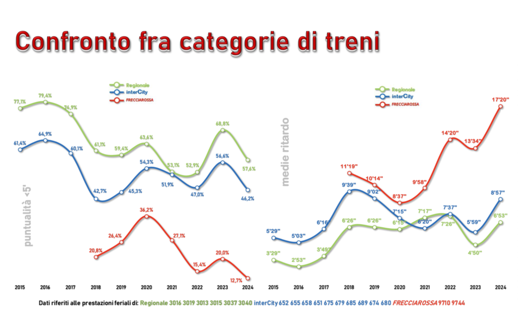 A subire le conseguenze peggiori sono stati i treni InterCity: la puntualità del 652 è scesa dal 51% al 27%, con un aumento medio di 5 minuti di ritardo rispetto al 2023.
